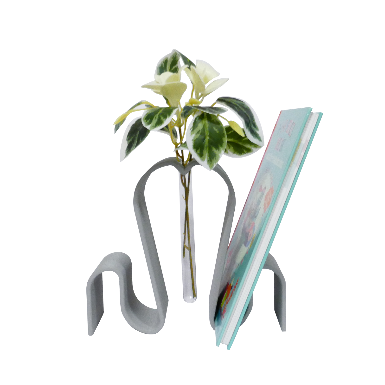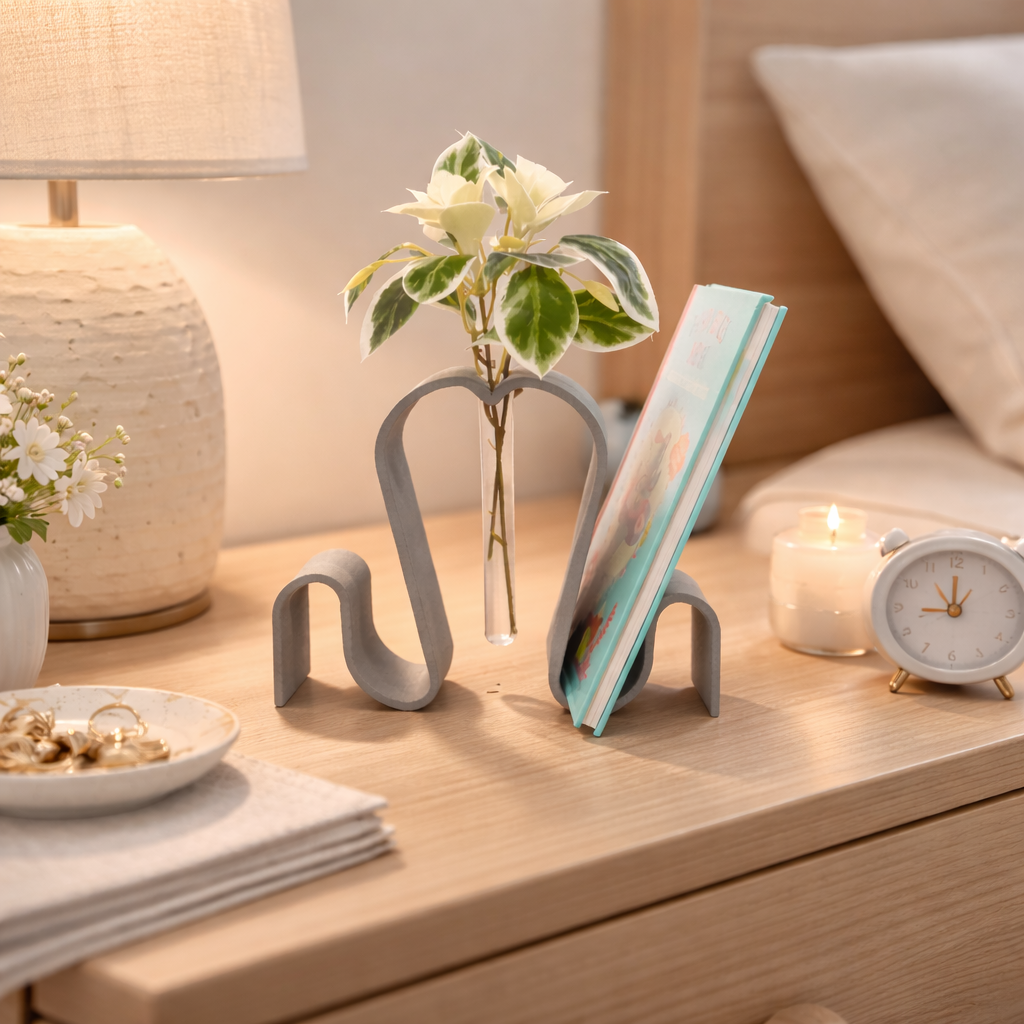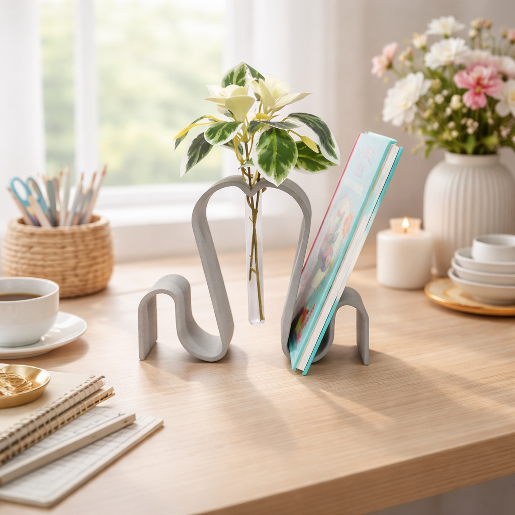 Obiect decorativ modern 2-în-1, realizat prin printare 3D, care îmbină elegant un suport pentru carte cu o vază minimalistă din sticlă. Design fluid, culoare caldă tip terracotta – perfect pentru living, birou sau dormitor.
