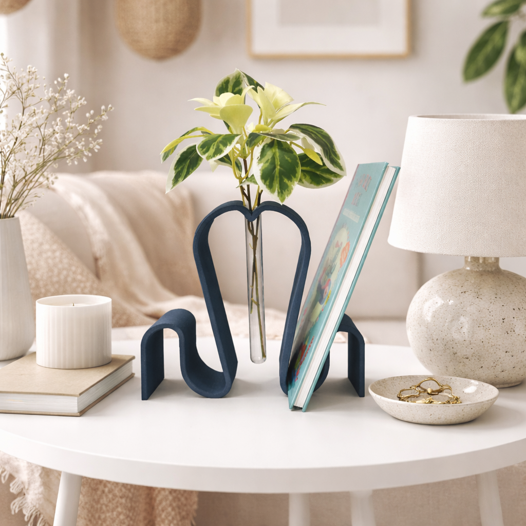Obiect decorativ modern 2-în-1, realizat prin printare 3D, care îmbină elegant un suport pentru carte cu o vază minimalistă din sticlă. Design fluid, culoare caldă tip terracotta – perfect pentru living, birou sau dormitor.